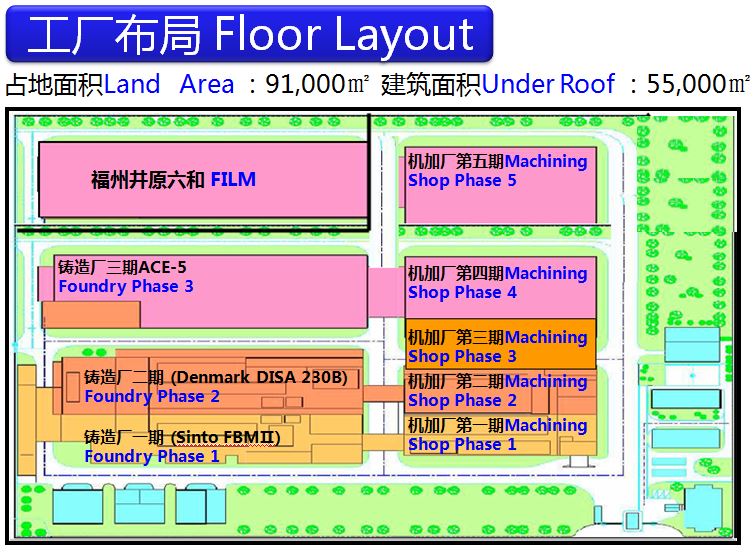 1.鑄造廠: 主要材質:灰口鑄鐵&球墨鑄鐵(FC150-FCD700部品、高硅高鉬等部品) 造模產線:3條(FBM&DISA&ACE) 產能合計5,100噸/月。熔解爐(中頻電爐):3T-8支/5T-4支 砂模尺寸:900*800*230-260(ACE-5),535*650*X(DISA,X指可調),420*520*150-180(FBM-II) 鑄件重量:0.2Kg-30Kg(Max:70Kg) |